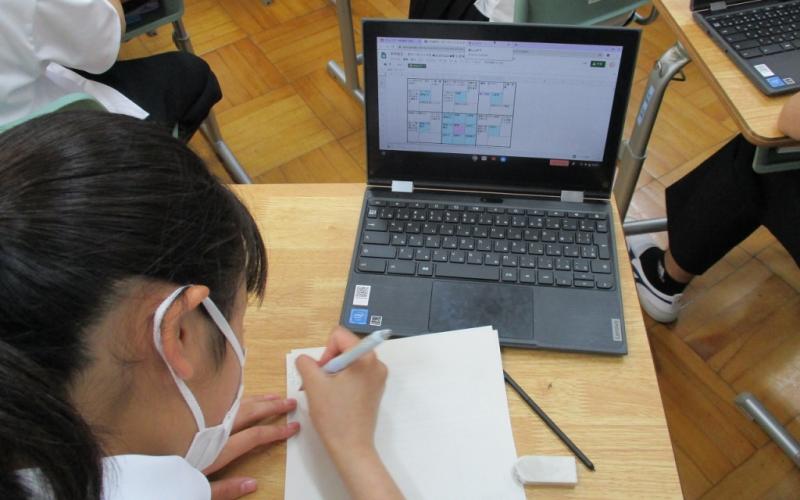 そのような問いから始まり、古語辞典をめくりながら言葉を追って根拠を探し、いわゆる意訳のわけを解明していきました。教科書に対して受け身になるだけではなく、能動的に問いかけていくことでアクティブな学びの時間が生まれます。写真は班活動ですが、classiノートを活用し、他の班の意見や考えもリアルタイムで共有しています。