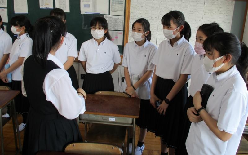 附属中の2年生から、中学の新入生に対して探究活動のプレゼンテーションを行いました。昨年度の活動内容をスライドにまとめ、説明を行います。今後新入生は、興味をもったグループの活動に加わり、地域の課題を解決するべく共に探究していくことになります。グループ編成後にはお互い積極的にコミュニケーションをとり、親密さを深めることができました。